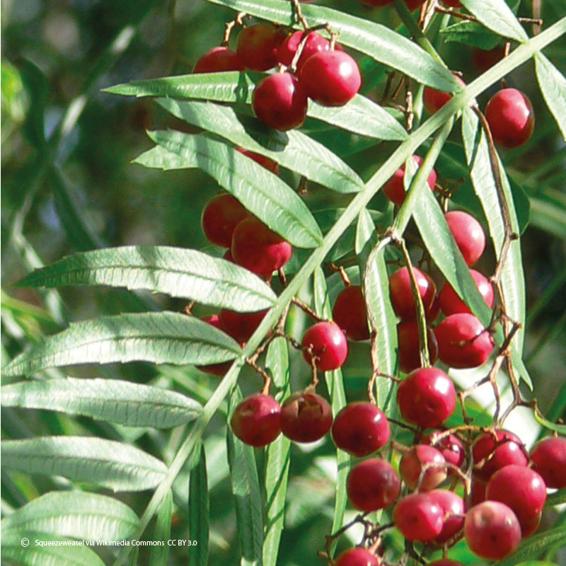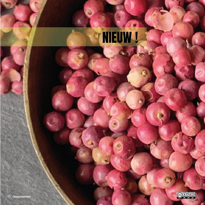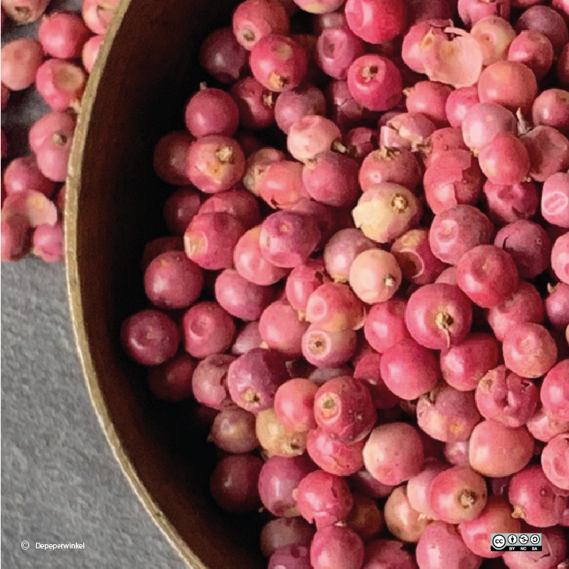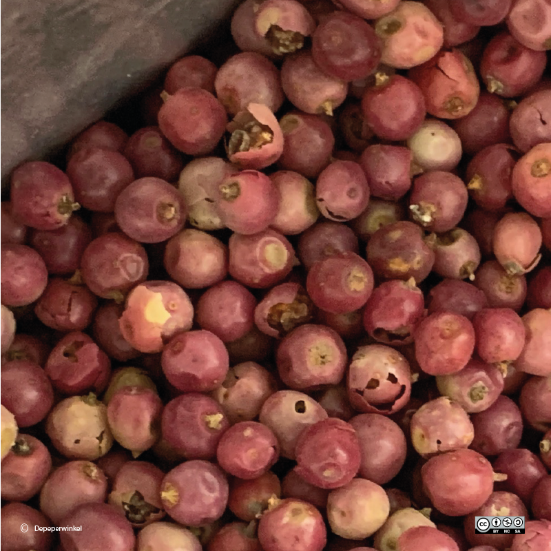 The pink pepper is not pepper, because it is not part of the pepperfamily (Piperaceae), but of the smoke tree family, a not so well-known family, but with well-known plant species such as the cashew (nut), the pistachio (nut), sumac (herb), mango and the Greek mastic. The Peruvian peppertree (Schinus molle) is native to South America, just like the Brazilian peppertree (Schinus terebinthifolius). Both are used as spices.