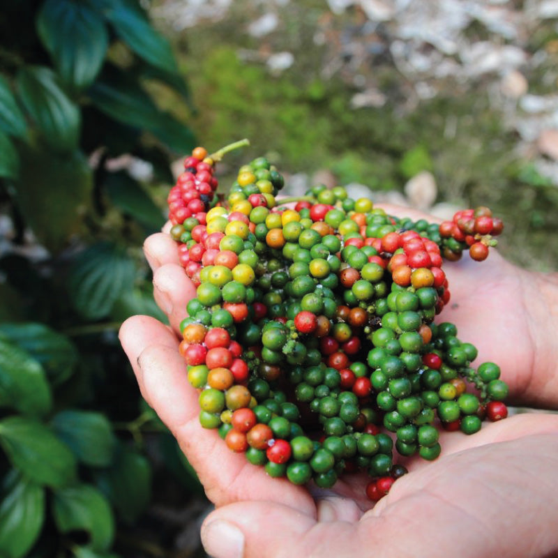 Ieder jaar worden de peperplanten gesnoeid, in tegenstelling tot andere pepers, zelfs de premiumpepers uit het Indiase Kerala. De onrijpe bessen voor de zwarte gedroogde peper worden in het voorjaar geoogst, en later in de zomer de rijpe exemplaren voor de witte peper.