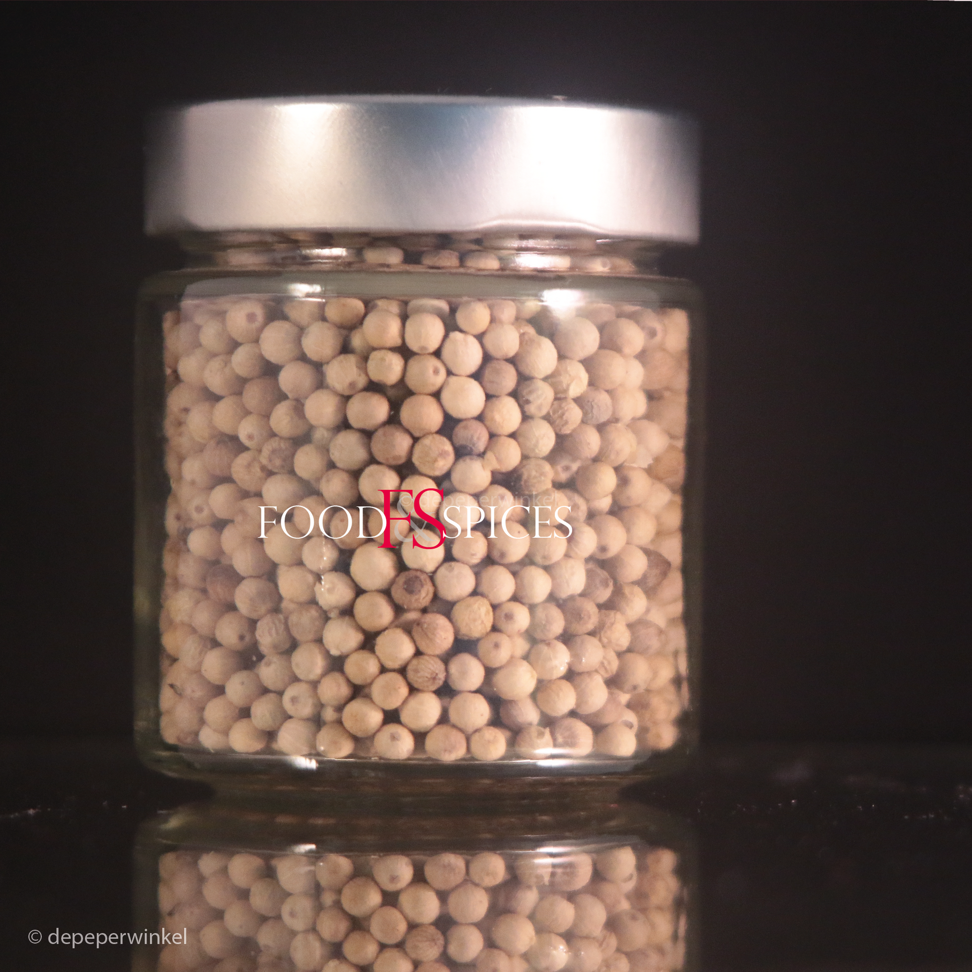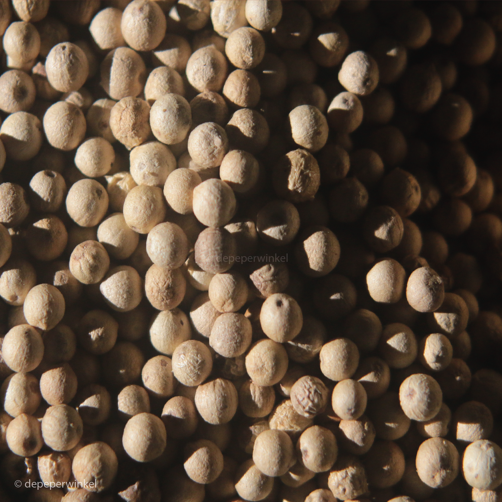 Witte Sarawak-peper heeft een nog lichtere citrussmaak dan zwarte Sarawak, maar duidelijke accenten van musk en zoethout (drop), en wordt alom geprezen als de beste witte peper ter wereld. De roomkleurige peper wordt gemaakt door de rijpe bessen in jute zakken in stromend water te laten weken. Na een week zijn de schilletjes los en kunnen deze van de korrels gescheiden worden, de korrels gestoomd en vervolgens op een goed geventileerde plek uit de zon gedroogd.