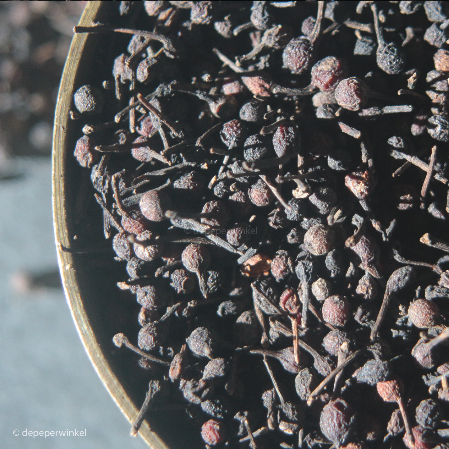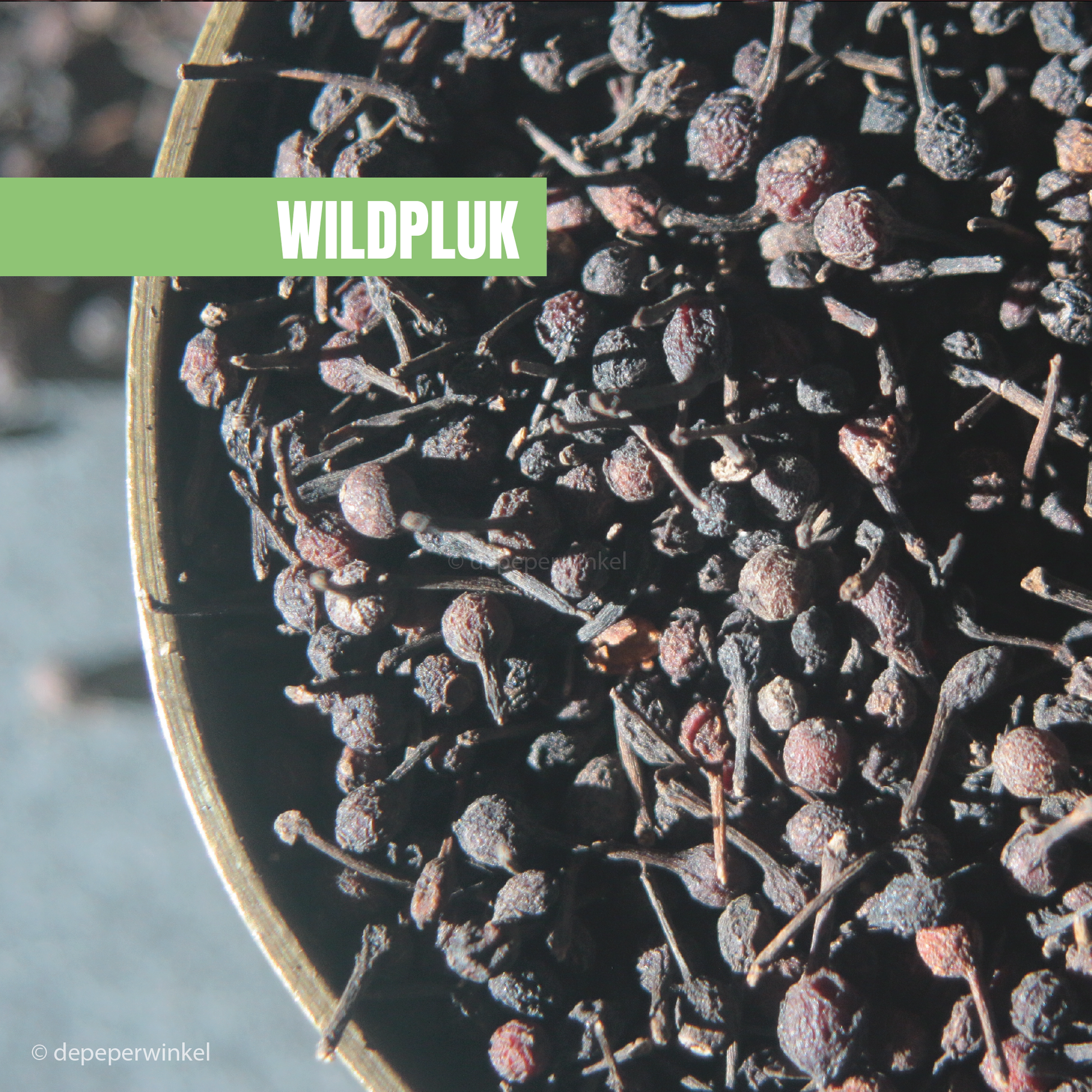 Het plukken van de vruchtjes is geen sinecure, de peper groeit op moeilijk toegankelijke plekken, de ranken groeien tegen bomen en rotswanden op. De vruchten bevinden zich aan het uiteinde van de ranken aan de jonge uitlopers, hoog in de ranken. De vruchtjes zijn 5 mm groot en rond, na droging een fractie kleiner (3 mm). Je herkent ze onmiddellijk aan hun verhoudingsgewijs lange - eetbare - steeltje. De scherpte van deze peper wordt net als bij zwarte pepers en lange pepers bepaald door peperolie (piperine).